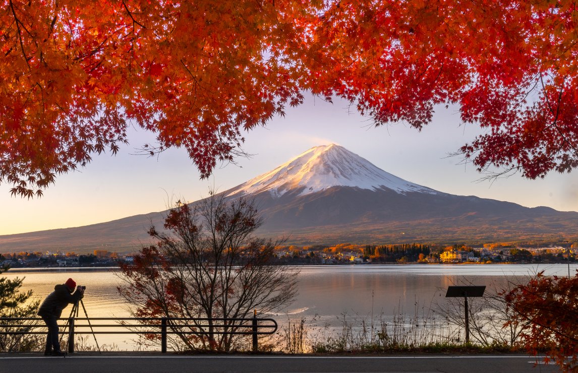 ^ The view of Mt Fuji in autumn from lake Kawaguchiko
